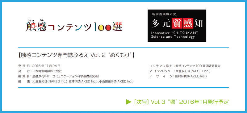 大屋友紀雄(NAKED Inc. /クリエイティブ・ディレクター)2015年4月に、ニコニコ超会議用の小冊子として発行された『ふるえ』が、期間限定ですが、しばらく定期刊行できるようになりました!今回は触覚のなかでも温度を巻頭に、質感研究でも大きなトピックでもある多元質感知を取り上げました。誌面の関係で泣く泣く削ったエピソードもあり、このあたりはどこかでオモテに出るようにしたいなあ、という今日このごろです。前号同様タイトなスケジュールになってしまい、関係各位には深くお詫びしつつ、実は次号の文字起こしを早くやらないと、という言い訳は、編集後記の様式美です。に、しても、映像をメインに仕事をしてきて、こういう状況になるとは夢にも思いませんでした。SFが好きで若かりしころに面白いなあ、と思っていたことが、どんどん現実化している現在はとても刺激的。次号は音と触覚についてお届けする予定。引き続きよろしくお願いします。