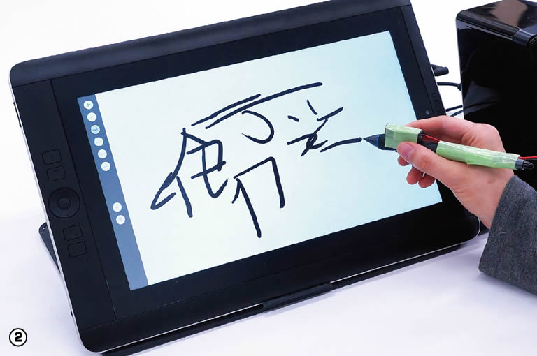 これを利用して、手書き文字をストローク単位でバラバラにしてそれを再構成してアニメーション表示する、という作品を制作しました(写真2)。1ストロークずつ、書かれたときと同じ速度で描画されつつ、スタイラスが振動し音が再生されるのですが、このときに他人が書いた文字と入れ替えて再生すると、なんともいえない奇妙な感じを手の内に感じます。特に、自分の名前のように、書き慣れた文字だと奇妙さが強まるようです。目下はこの奇妙な感じが起きる要因を探るべく研究を進めています。