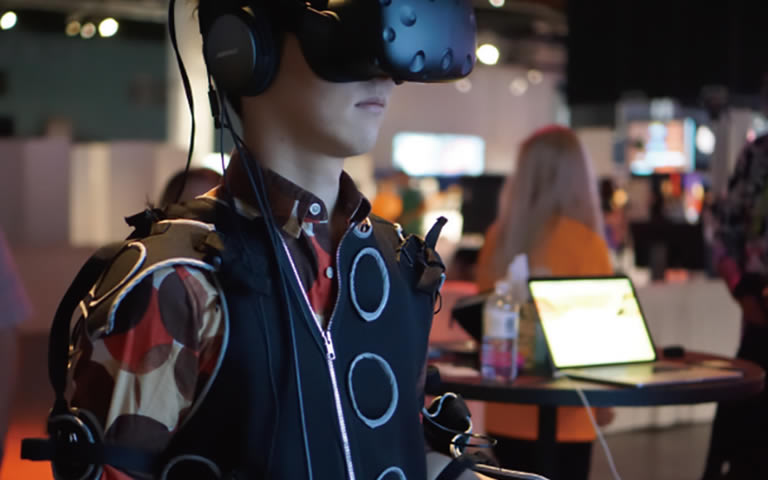 「Rez Infinite Synesthesia Suit」は、別のアプローチで身体境界が変容する体験ができる装置です。これは、PlayStation® VR用の3Dシューティングゲーム「Rez Infinite」用に作られた全身触覚ボディースーツで、シーンに合わせてデザインされた全身の振動エフェクトを感じながらゲームをプレイできます。最初はアトラクション的な感覚を楽しんでいたプレイヤーは、そのうちに自分が見ている空間と身体の境界が溶けていくような感覚に陥ります。「自分が音楽になった気分」「空間と一体になった」といった感想のほか、「浮遊感」という表現をする人も多いのが特徴です。このように、身体の境界をデザインすることは実感を設計する上で重要な要素であるといえます。