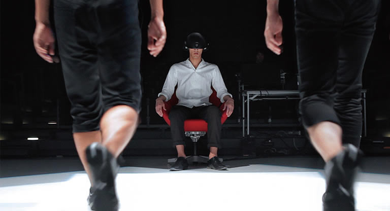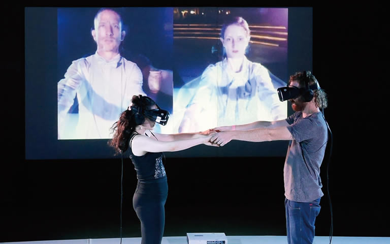 そこで、生身の人と人との関係自体に影響を与えたいと思い、体験者と体験者のインタラクション、さらにダンサーとのインタラクションを加えたらどうなるかと考えました。それで生まれたのが「Neighbor」*3という作品です。お互いを知らない男女の体験者に、手を握り合ったり、インタラクションしてもらい、そこにパフォーマーが映像上で入れ替わったり、踊ったり、いろいろと介入してくるという内容です。