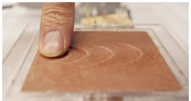 新しいスイッチインタフェースのコンセプトプロトタイプである本作品は、日常的に利用している既存スイッチのような「ボタンを押す」「特定の面を触る」といった操作とは異なり、「指をスライドさせて知覚的稜線を超える」という動作をスイッチおよび触覚フィードバックの生成源として利用することで、まったく新しい体験を実現します。このインタフェースは、立体的な段差や障壁などの知覚稜線によって区切られた2つ以上のタッチセンシング領域で構成されています。