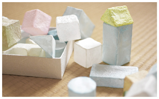 「積み紙」は、中が空洞で光にかざすと透けて見える和紙の“ つみき” です。動物の本能として備わる、“赤ちゃんに接する際の優しく、緊張感を持った丁寧な動き” の習性から着想を得て、あえて繊細で壊れやすいつみきを作りました。