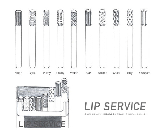 テクスチャ・シガレット「LIP SERVICE」は、伝統的な人間の嗜好品であるタバコを、唇へのHAPTICな刺激という観点でアップデートする試みです。10種の異なる質感素材で包むことで、唇で感触の違いを味えるタバコを作りました。